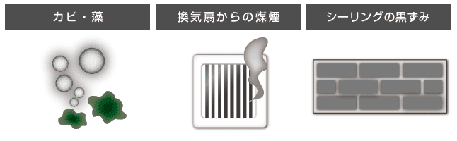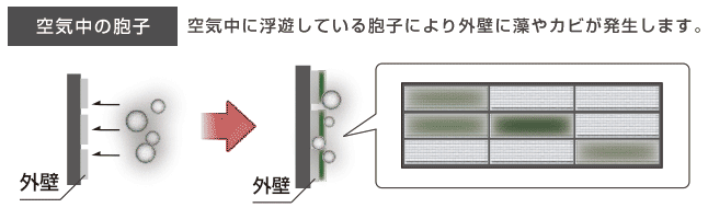 経年劣化で見た目の印象が悪い藻やカビ。壁の劣化現象は内部からだけでなく、外部からも起きています。付きにくい塗料があったらうれしいですね。