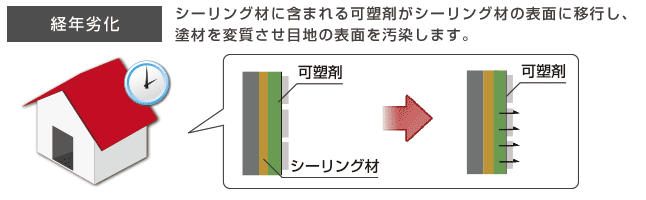 シーリング材の中には可塑剤が含まれています。時間が経つと、表面の塗料を変質させてほこりがつきやすくなります。改修工事の時「変成シーリング」の使用を業者にお願いしてください。